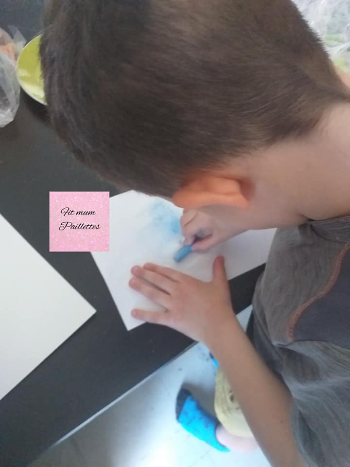 - sur une feuille blanche déposer un peu de sel , prendre la craie et la frotter sur la feuille , celle-ci va se réduire en poudre et la couleur se fondre avec le sel.