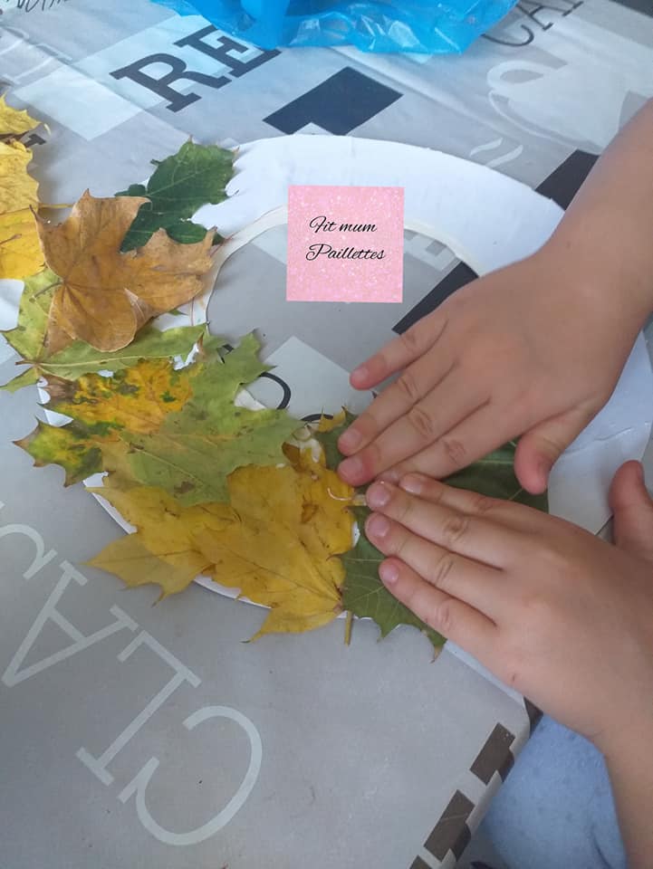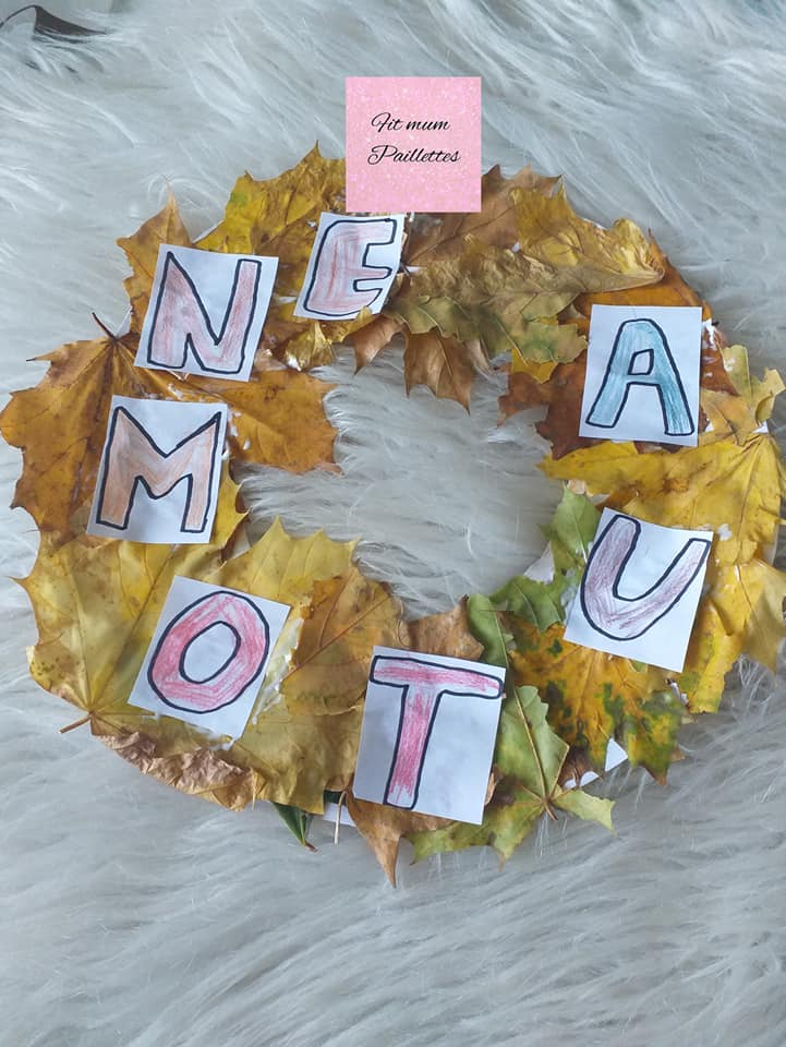 6) Découper les lettres et faites les coller par vos enfants sur la couronne . Petit hic pour nous nous avons collé les lettres dans le mauvais sens mais bon Baby fée était toute fière de sa couronne d’automne .