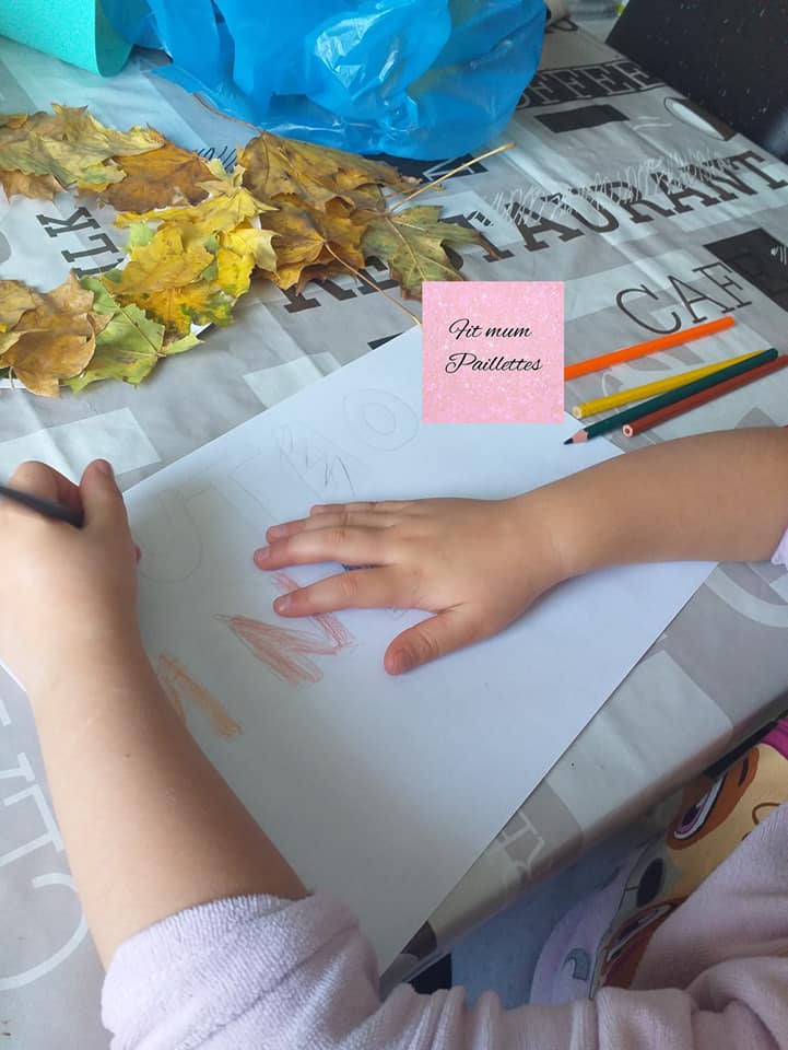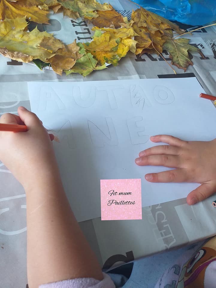 4) sur la feuille blanche écrivez les lettres que vous souhaitez , avec Baby fée nous avons choisi le mot AUTOMNE.
